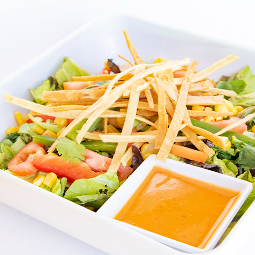 Una ensalada con elote, tomate, cilantro, pimientos, tortilla chips y aderezo de chipotle.