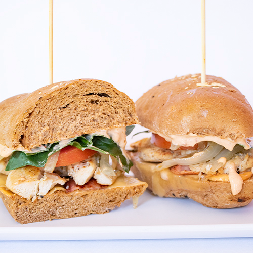 Con pollo, mayonesa de chipotle, queso, tocino, espinaca, tomate y cebolla caramelizada. Acompañado con 150gr papas a la francesa.